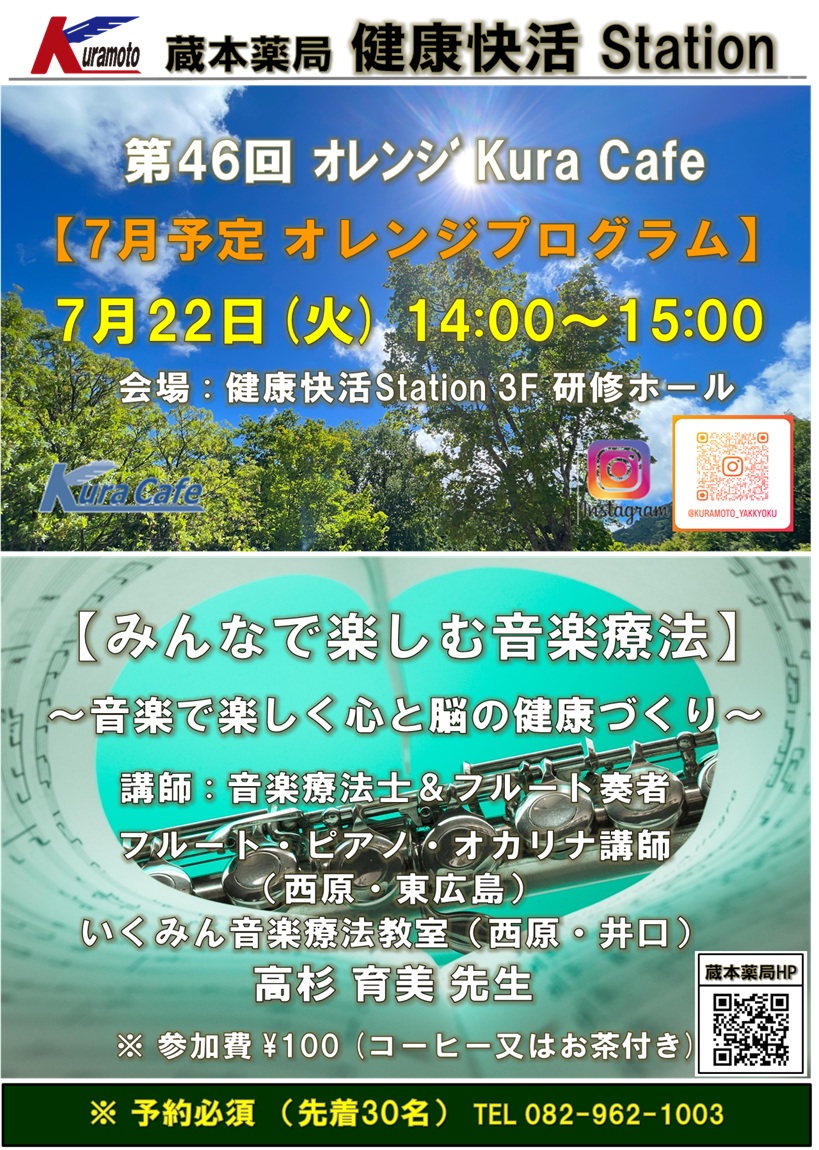 | イベント内容 | ~ 第46回オレンジ Kura Cafe ~ 【みんなで楽しむ音楽療法】 ~ 音楽で楽しく心と脳の健康づくり ~ 講師 : 音楽療法士・フルート奏者 参加費 : 100円(ドリンク付) 要予約 : お電話又は来局にて ※健康保持増進に興味のあるご本人・ご家族・専門家 すべてが参加可能 ※ 高齢者いきいき活動ポイント対象 |