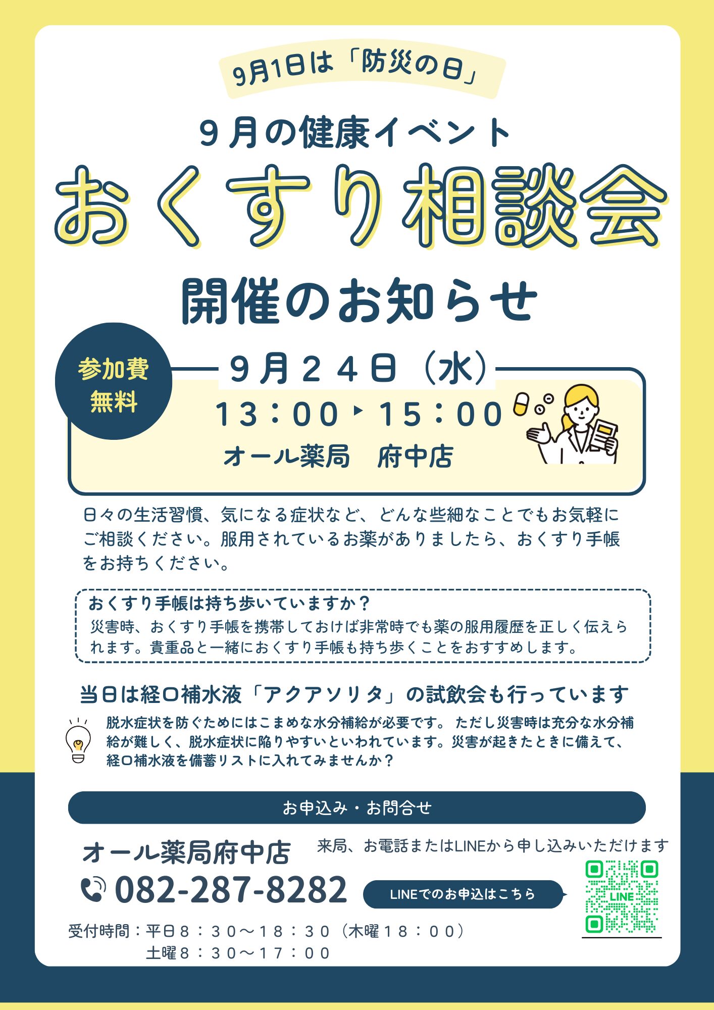 | イベント内容 | おくすり相談会を開催します。 日々の生活習慣、気になる症状など、どんな些細な事でもお気軽にご相談ください。 服用されているお薬がありましたら、おくすり手帳をお持ちください。 当日は経口補水液「アクアソリタ」の試飲会も行っております。 お気軽にお越しください。 |