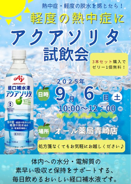 | イベント内容 | アクアソリタの試飲を行います。 体内への水分・電解質の素早い吸収と保持をサポートする、毎日飲めるおいしい経口補水液です。 処方せんがなくてもお気軽にお越しください。 |