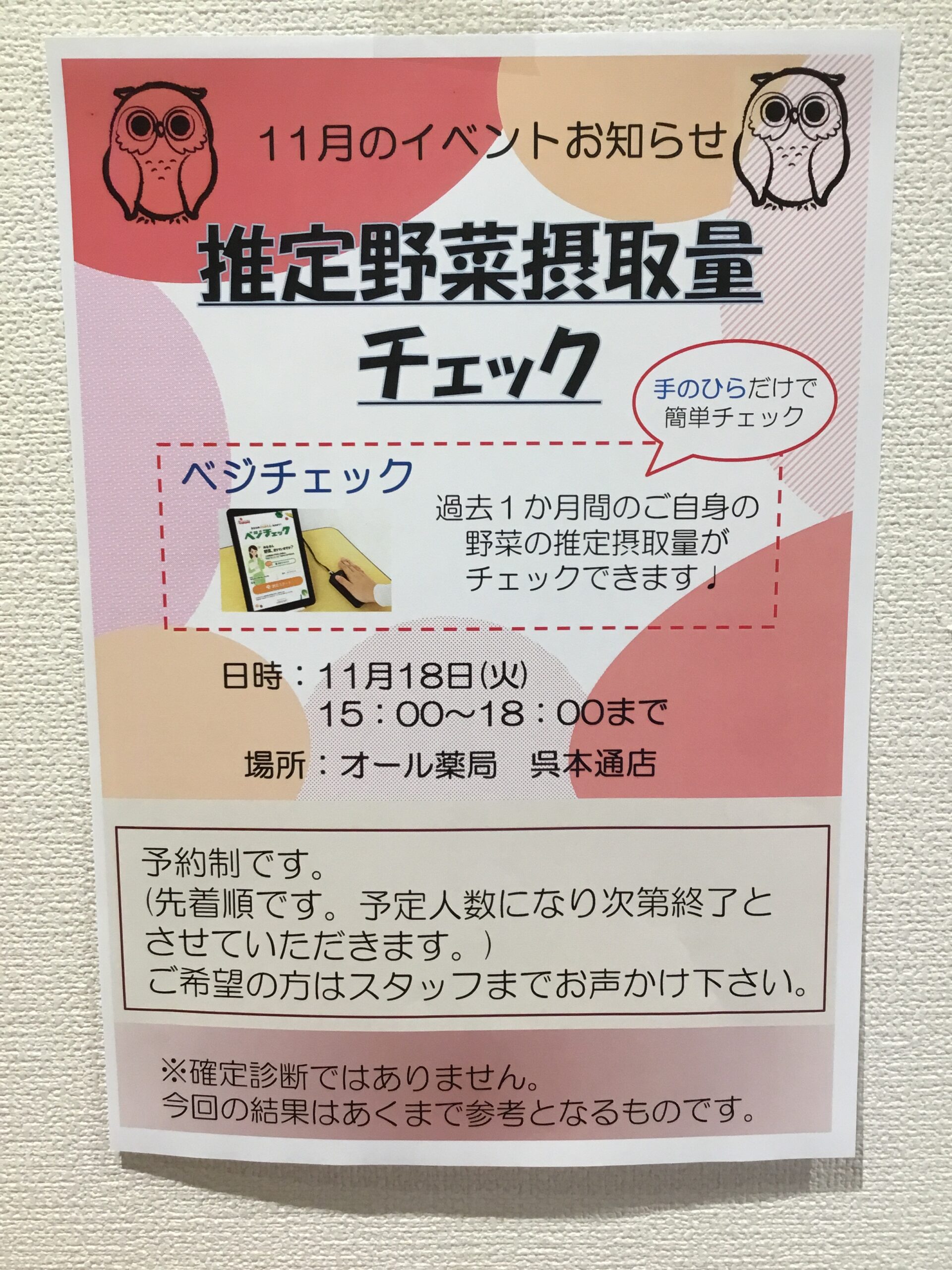 | イベント内容 | 手のひらだけで簡単に計測できるベジチェックを使用し、過去1ヶ月間の野菜の推定摂取量をチェック。 予約者優先ですが、定員に達するまでは参加できますので、スタッフにお声かけください。 |