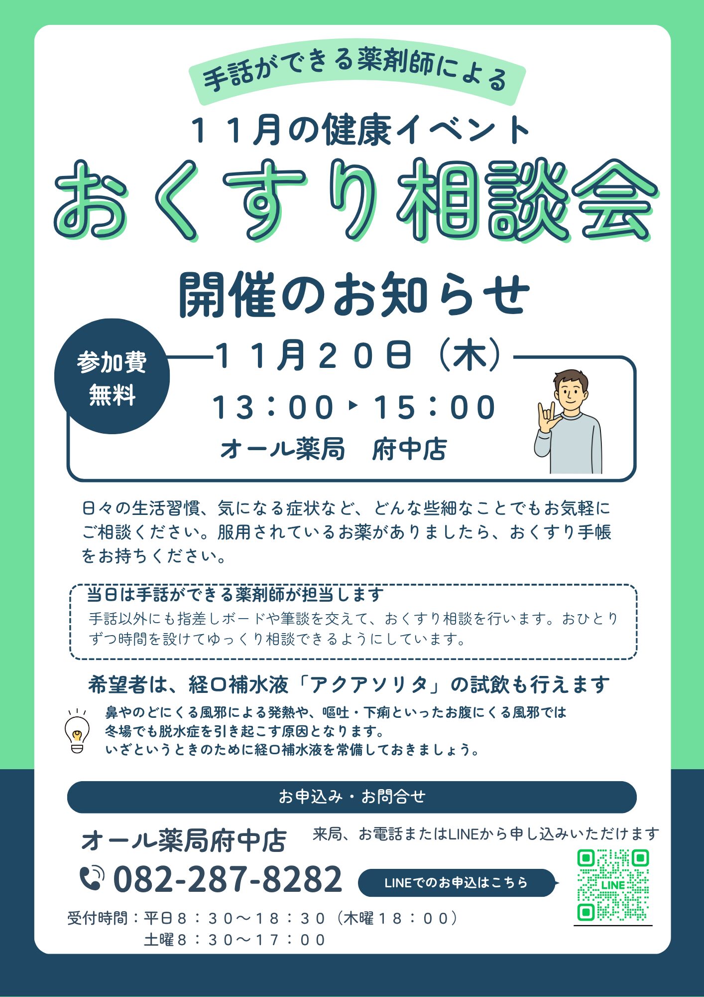 | イベント内容 | 当日は手話ができる薬剤師が担当いたします。 手話以外にも指差しボードや筆談を交えて、おくすり相談を行います。 服用されているお薬がありましたら、おくすり手帳をお持ちください。 ふだん聞けない日々の生活習慣や気になる症状など、どんな些細な事でもお気軽にご相談ください。 また事前にご予約いただくと時間を設けてゆっくりお話しできます。 詳しくは薬局までお問い合わせください。 |