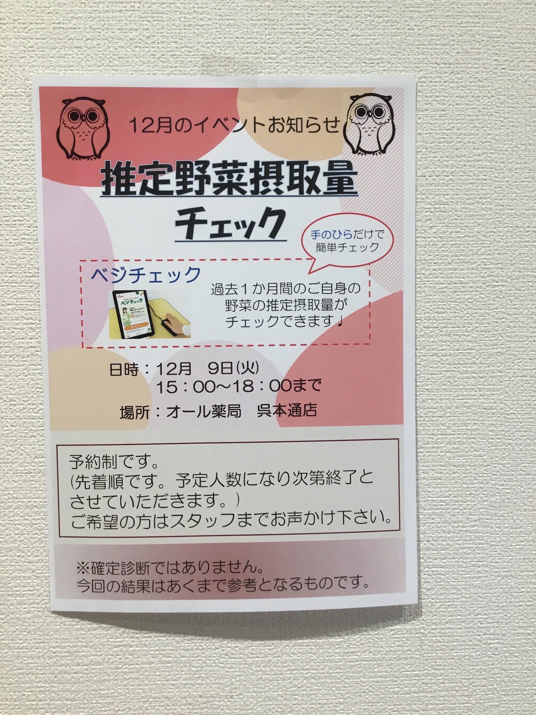 | イベント内容 | 手のひらだけで簡単に計測できるベジチェックを使用し、過去1ヶ月間の野菜の推定摂取量をチェック。予約者優先ですが、定員に達するまでは参加できますのでスタッフにお声かけください。 |