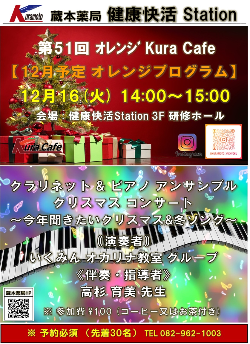 第80回 地域健康教室 認知症カフェ ~ 第51回オレンジ Kura Cafe ~【クラリネット・ピアノ アンサンブル クリスマス コンサート】