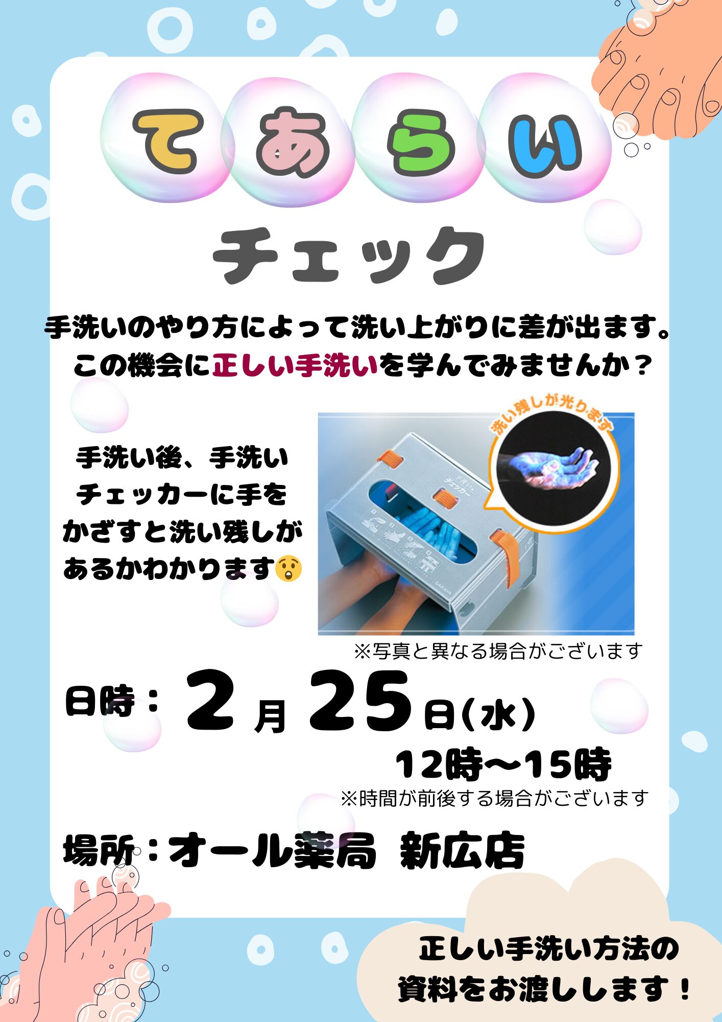 | イベント内容 | あなたはきちんと手洗いができていますか? ちゃんと手を洗っているつもりでも、意外に汚れやウイルスは残っているものです。 洗い残しが光って見える手洗いチェッカーを使って、 正しい手洗い手順を再確認してみませんか? ご自身やご家族の健康を守るために、 「正しい手洗いスキル」を身につけましょう。 無料でできますので、ぜひご利用ください。 |