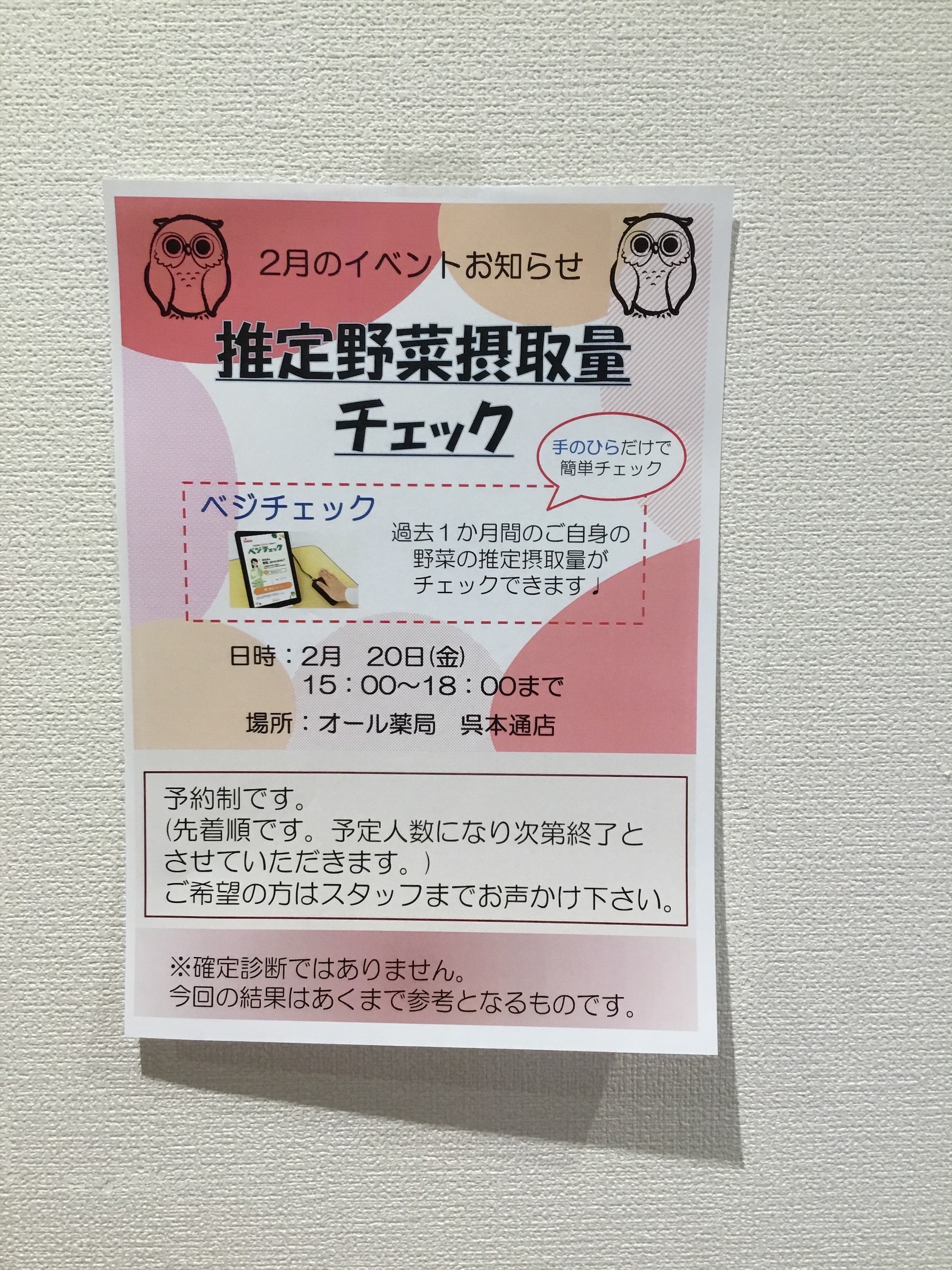 | イベント内容 | 手のひらだけで簡単に計測できるベジチェックを使用し、過去1ヶ月間の野菜の推定摂取量をチェック。予約者優先ですが、定員に達するまでは参加できますのでスタッフへお声かけください。 |