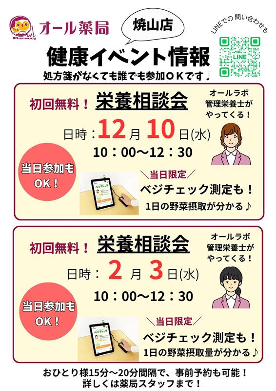 | イベント内容 | 管理栄養士による栄養相談会を実施。 おひとり15~30分間隔で、予約も可能。 待ち時間にベジチェックにて野菜の推定摂取量を測定可能。 随時お薬や健康相談も受け付けております。 |