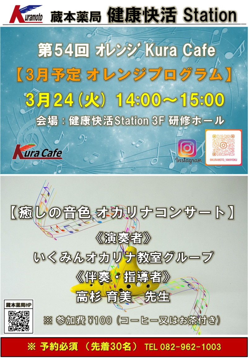 | イベント内容 | 第54回~オレンジ Kura Cafe 【癒しの音色 オカリナコンサート】 演奏者 : いくみんオカリナ教室グループ 参加費 : 100円(ドリンク付) 要予約 : お電話又は来局にて ※健康保持増進に興味のあるご本人・ご家族・専門家 すべてが参加可能 ※ 高齢者いきいき活動ポイント対象 |