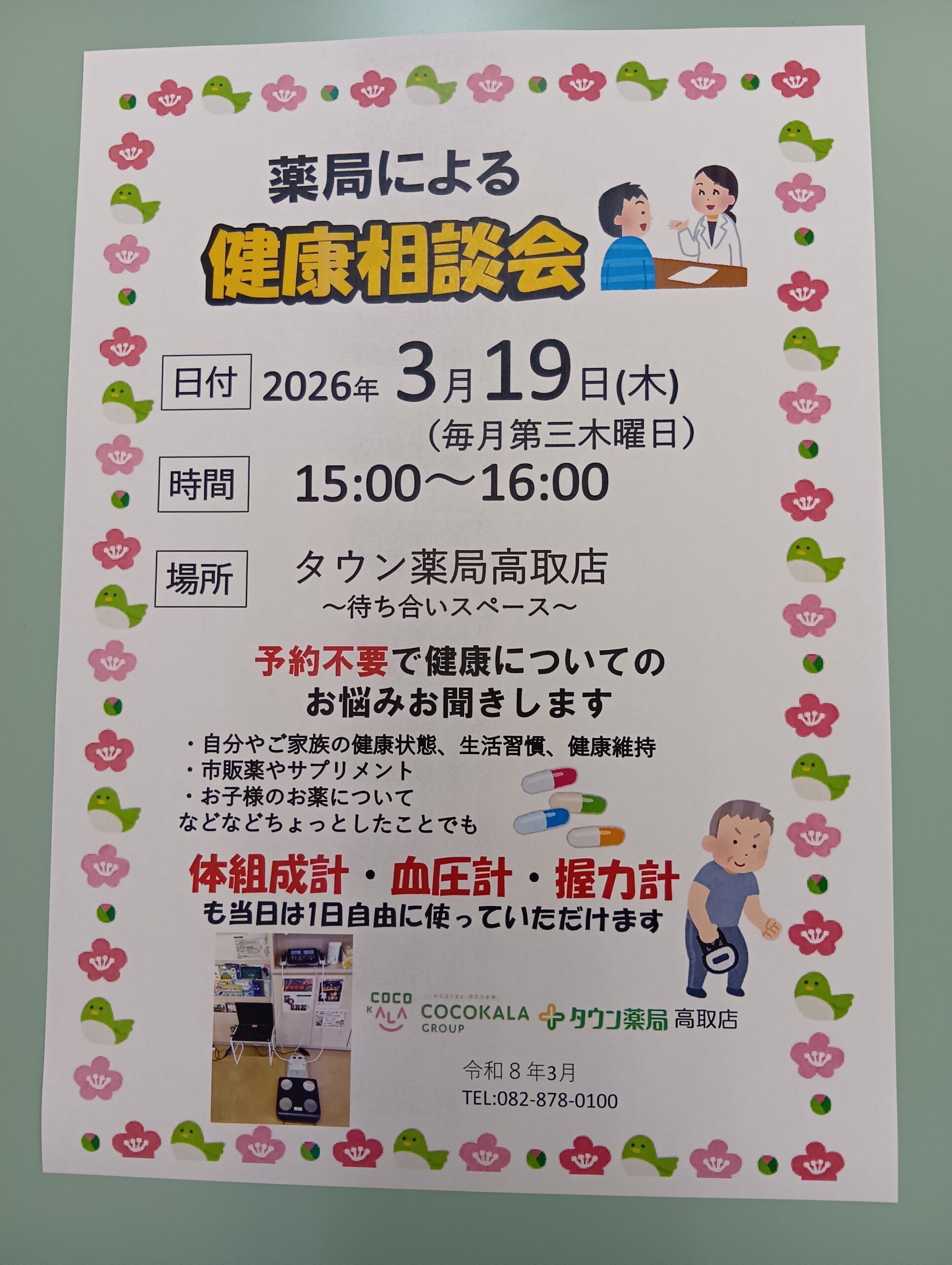 | イベント内容 | 健康についてのお悩みお聞きします 体組成・血圧・握力の測定は当日なら時間外でも行っていただけます |